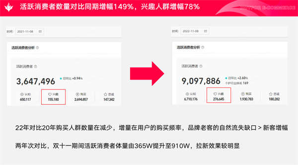 其中,發(fā)現(xiàn)人群增長(zhǎng)270萬(wàn)、種草人群增長(zhǎng)9萬(wàn)、互動(dòng)人群增長(zhǎng)3.5萬(wàn)、行動(dòng)人群增長(zhǎng)2.7萬(wàn)、首購(gòu)人群增長(zhǎng)3.3萬(wàn)、復(fù)購(gòu)人群增長(zhǎng)0.6萬(wàn)、至愛人群增長(zhǎng)0.2萬(wàn)、站內(nèi)廣告投產(chǎn)1:7。
