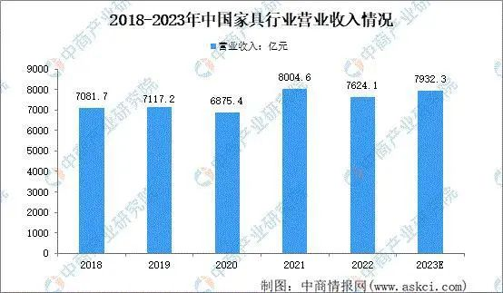 數(shù)據(jù)顯示,2022年受疫情和外貿(mào)等因素影響,我國家具行業(yè)規(guī)模以上企業(yè)實現(xiàn)營業(yè)務收入7624.1億元,同比下降-4.8%?;仡?018-2022年家具制造業(yè)營業(yè)收入情況:近年來,我國家具制造業(yè)營業(yè)收入總體呈小幅度下降趨勢,預計2023年我國家具行業(yè)復蘇營業(yè)收入將達7932.3億元。