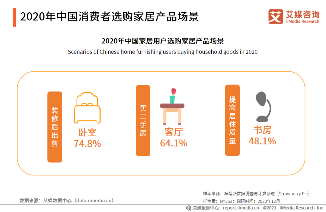 調查顯示,2020年,中國家居用戶選購家居產(chǎn)品場景分布中,“裝修后出售”為臥室購買家居產(chǎn)品的占比最高,為74.8%;裝修原因為“買二手房”中,為客廳購買家居產(chǎn)品的占比最高,為64.1%;為“提高居住質量”而為書房購買家居產(chǎn)品在各場景中占比最高,為48.1%。臥室作為人們進行睡眠放松的場所,勢必成為家居用戶“裝修后出售”而購買家居產(chǎn)品的首選。