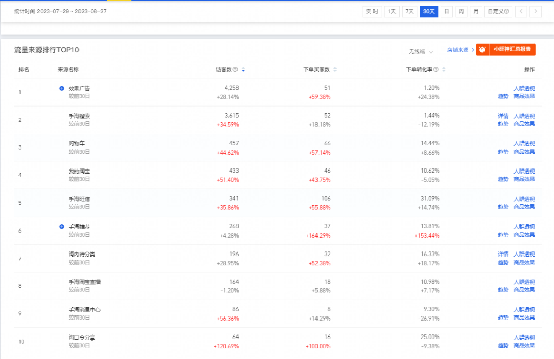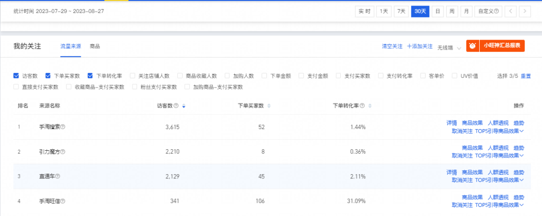3.店鋪核心詞和轉化人群確定之后,看整體店鋪流量結構,流量結構轉化率對比,免費流量轉化高就重點規(guī)劃周期增加免費渠道流量,優(yōu)化店鋪人群,階段轉化穩(wěn)定提高。