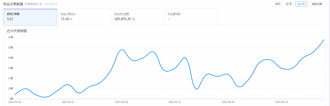 目前,粉絲訂單占比71.6%,粉絲復(fù)購率在5.33%左右??恐托暮图毿?,將售前與售后配合起來,店鋪在數(shù)據(jù)呈現(xiàn)上,減少了20%的售后率,也積攢了來之不易的口碑。